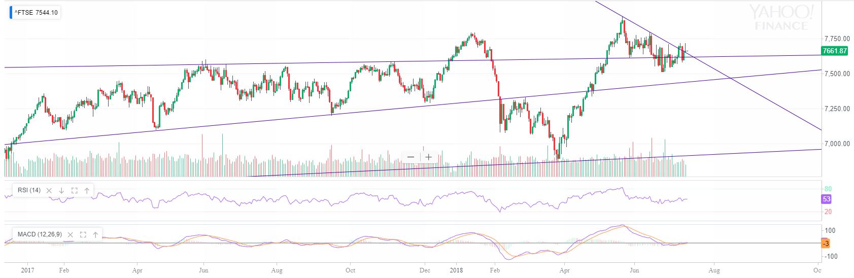 Standard & Poor’s 500 index successfully bounced from 100 MA as July arrived and recently the price landed on 4-month-old resistance. This is a good sign for the index to continue rising to the 2875 levels. Technicals are also playing in favor of the index rise. RSI is well positioned between 50 and 70, MACD has crossed the signal line into a positive territory, and Stochastics has just become overbought.
