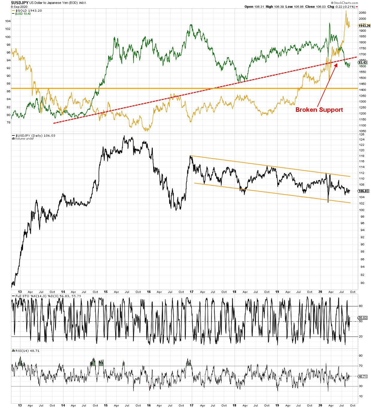 Furthermore, a condition of dollar can be also interpreted with its counterpart – Japanese Yen. You can see a clear downward pointing trend line channel. This is a strong point and unless this trend is ended, the dollar will likely stay in rather lower levels. This again means higher levels for gold.