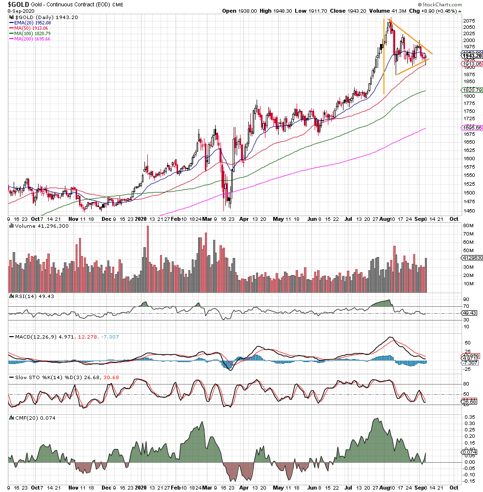 A price of gold has been consolidating for about a month since it has peaked over 2000. The consolidation is happening in a form of pennant. If the pattern completes, the price may go even higher. This happens in such situations as now, when the general market gets overbought and shows us pullbacks. Even a correction could happen due to a current no-easy situation in the US and Europe with Covid-19.